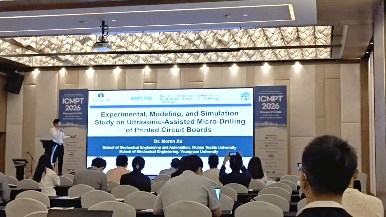武汉纺织大学威廉希尔williamhill官网徐默然副教授受邀出席本次大会,并在会上作专题报告。报告以《Experimental, Modeling, and Simulation Study on Ultrasonic-Assisted Micro-Drilling of Printed Circuit Boards》为题,聚焦印刷电路板微孔钻削的技术痛点,系统探究了超声辅助加工技术在微孔加工过程中的作用机理,分析了不同加工参数对孔表面质量、切削状态的影响规律,为印刷电路板高质高效微孔加工提供技术思路。此次研究兼具理论创新与工程应用价值,得到现场业内专家的广泛认可与积极评价,也直观展现出院校在机械工程新型加工技术方向的科研积淀与自主创新水平。