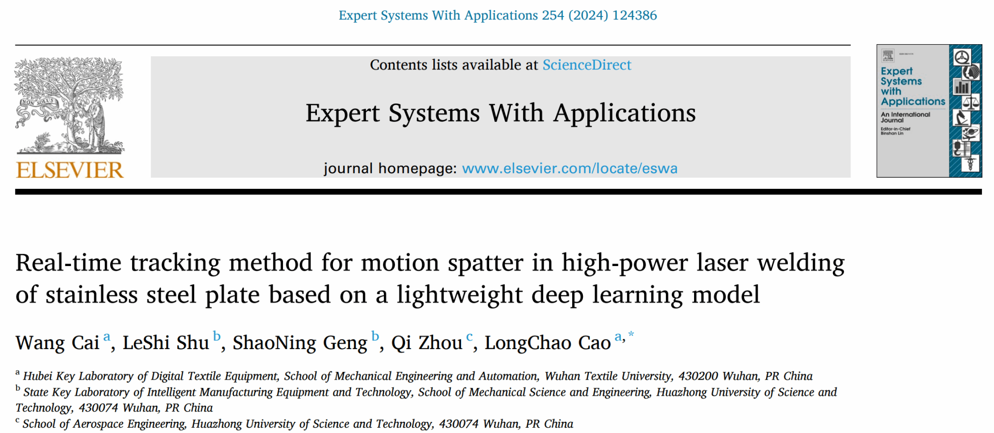 近日,我校威廉希尔williamhill官网曹龙超博士课题组青年教师蔡旺在激光加工过程智能监测方面取得了重要的研究进展。相关成果以“Real-time tracking method for motion spatter in high-power laser welding of stainless steel plate based on a lightweight deep learning model”为题发表在计算机科学领域中科院一区Top期刊《Expert Systems with Applications》(ISSN:0957-4174)上。该论文的第一单位为武汉纺织大学,第一作者为威廉希尔williamhill官网蔡旺博士,通讯作者为威廉希尔williamhill官网曹龙超特聘教授。