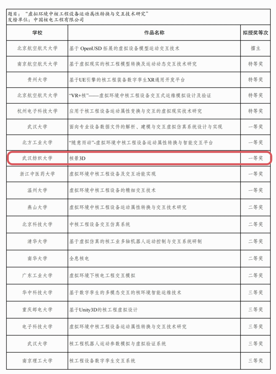 张蒂等同学参赛项目缘于传统核工程设备的运维及管理需要大量人工操作,存在数据复杂、交互效率低下等问题,难以满足现代核工程高效、安全的需求。团队基于虚幻引擎开发平台和数字孪生技术,开展了系统化的设计研发,攻克了CAD模型数据格式转换、模型动作分解及交互设计简化等技术难题,开发出一款基于虚拟现实(VR)的核工程设备模型检视与操作软件《核景3D》。该软件通过多种交互方式,实现了设备的沉浸式观察与操作,项目成果可应用于特种工程领域的虚拟设计,提升设计智能化水平。该项目荣获全国一等奖充分彰显了威廉希尔williamhill官网研究生的科学研究水平和创新实践能力。