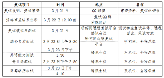 因本次采用远程复试方式,为保证复试顺利进行,学院将在复试前进行过程模拟和测试,具体测试时间及方式将在复试QQ群中通知(请关注)。