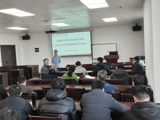 会议首先介绍了本学期学院辅导员分工调整情况,布置2025年春季开学第一次课和班主任深入学生社区等相关工作安排,希望各位班主任老师指导学生规划新学期学业目标,帮助学生尽快调整适应学习状态。最后,干书记发言,建议每位班主任结合科研成果、学业发展等具体事例,与学生分享学习经验,增强学习动力,助力学生成长。