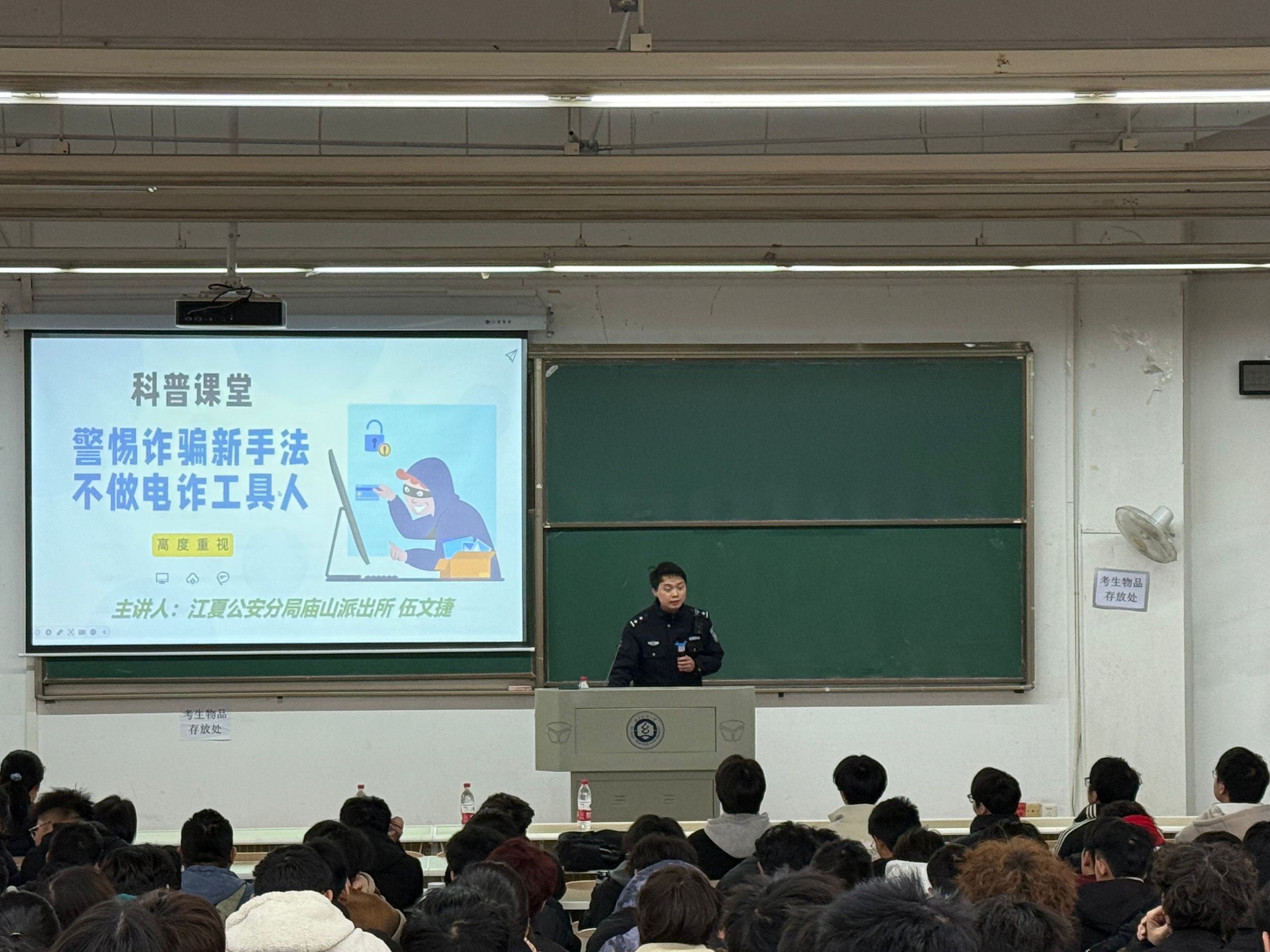 为了进一步加大防电信网络诈骗的宣传教育力度,预防校园电信网络诈骗案件的发生,3月11日中午,威廉希尔williamhill官网邀请武汉市江夏区庙山派出所伍文捷警官开展反诈安全知识讲座,全力守护学生的“钱袋子”。威廉希尔williamhill官网党委副书记周玉艳,辅导员和学生代表共同参与。