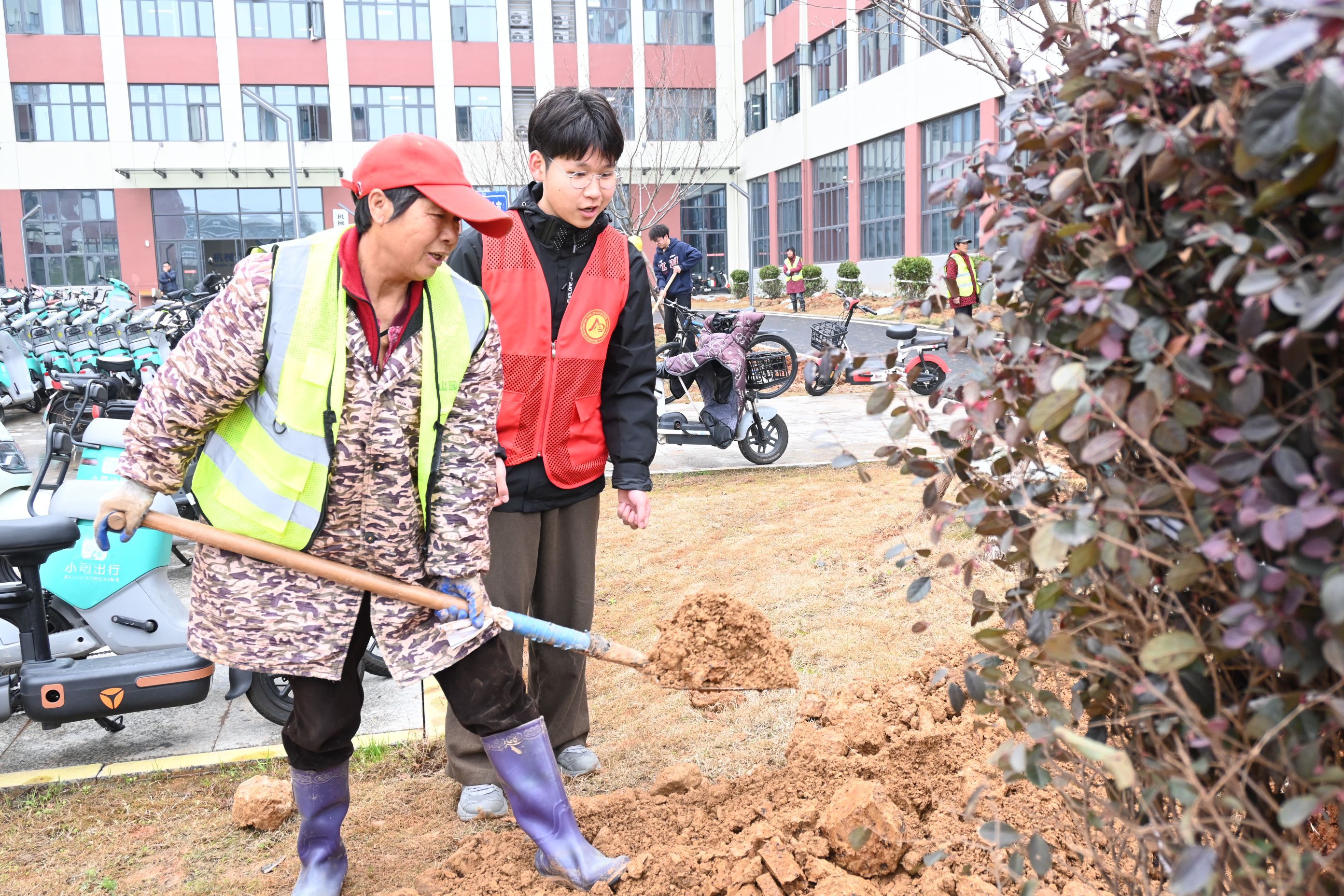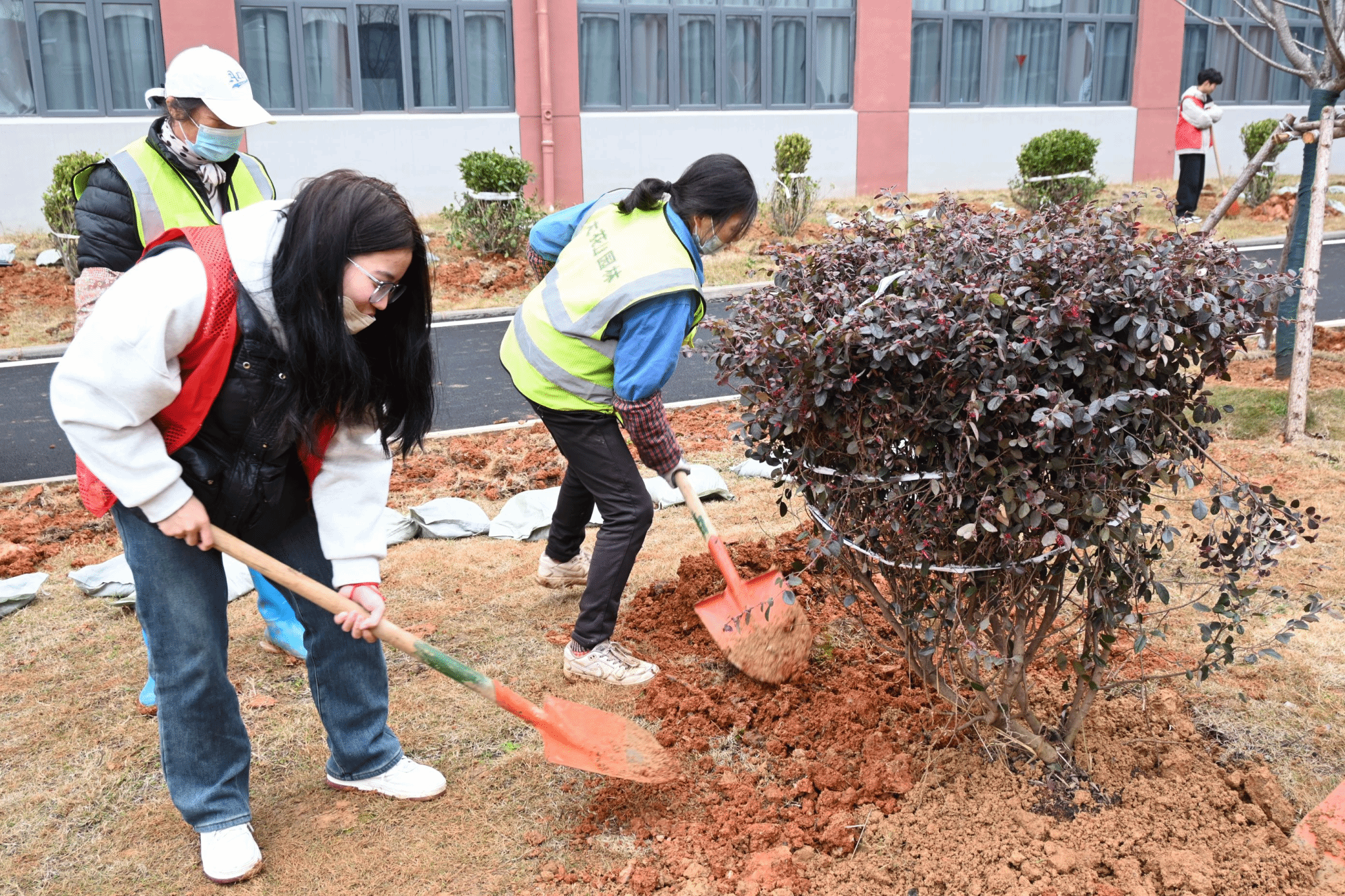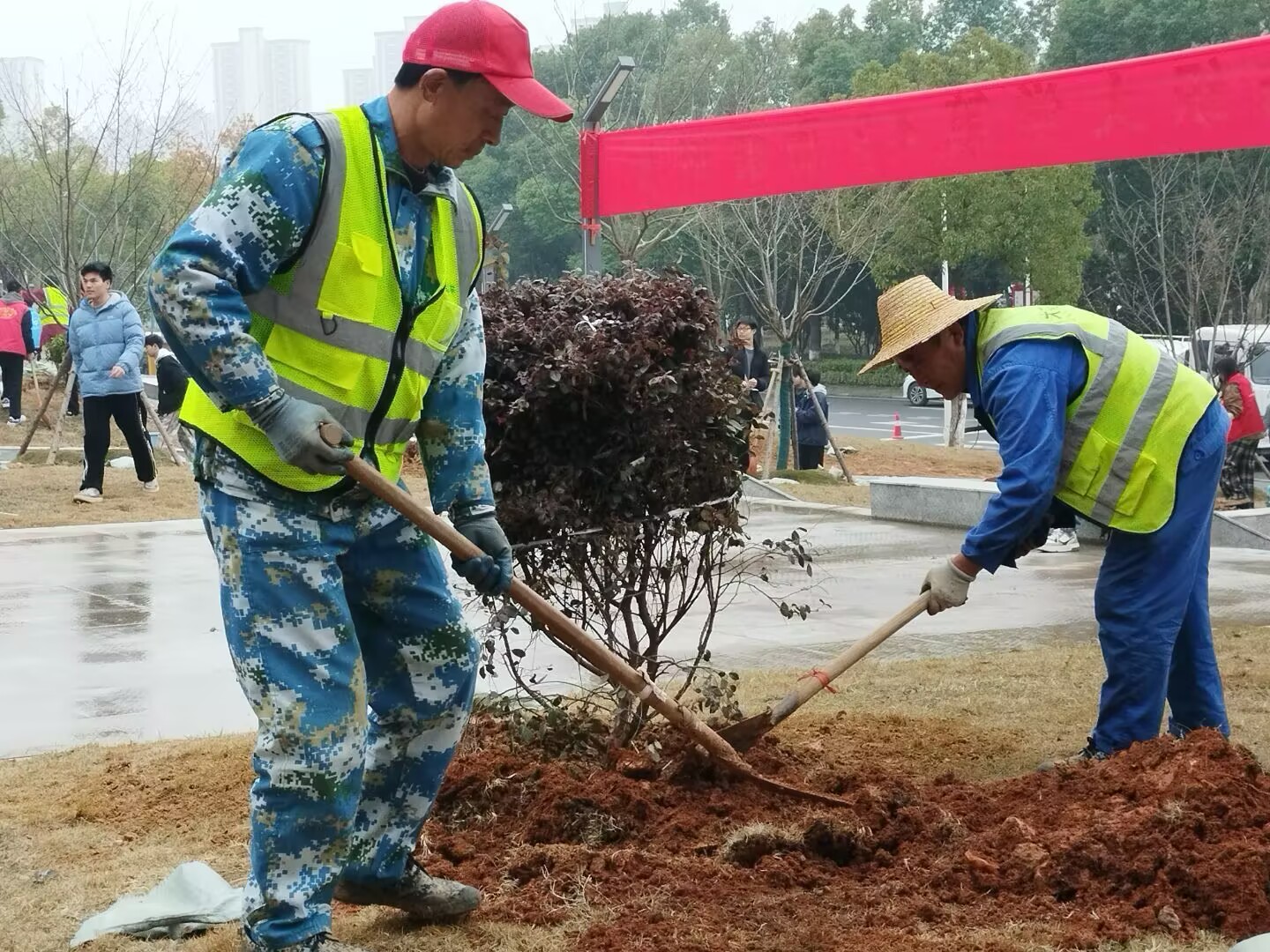 图为后勤工人协助种树