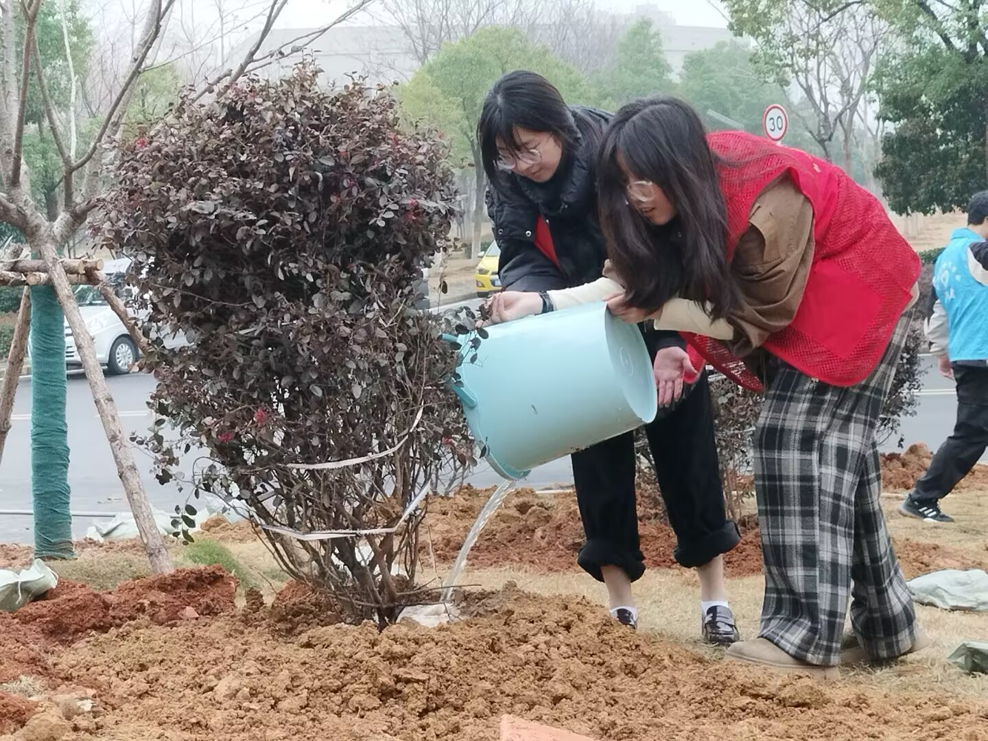 图为志愿者们为种好的树苗浇水