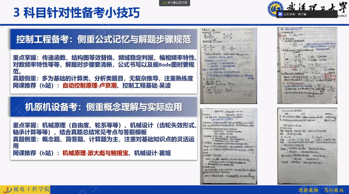 在笔试方面,王烨学长提醒,对于难度较大的专业课必须尽早启动系统复习。徐子豪学长则给出了更具体的策略,如针对《自动控制原理》等课程选择合适的网络课程资源,对于《机械设计》等科目需总结答题模板,提高应试效率。