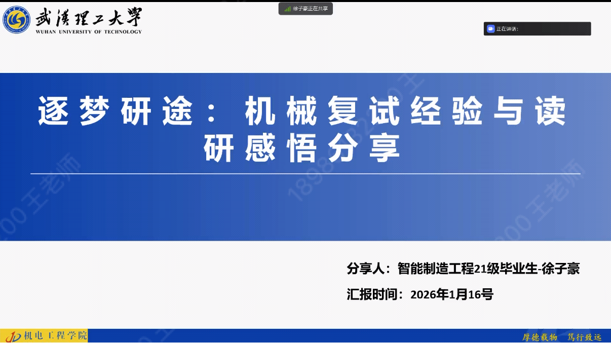 面对日益激烈的考研竞争,如何高效备考、成功突围?近日,机械学院成功举办26届毕业生考研经验分享会,特邀两位已在知名高校深造的优秀校友——现就读于武汉理工大学的智能制造12102班徐子豪学长,以及现就读于哈尔滨工程大学的自动化12103班王烨学长,为备战2026年考研的学子们带来了一场干货满满、视角独到的经验分享。