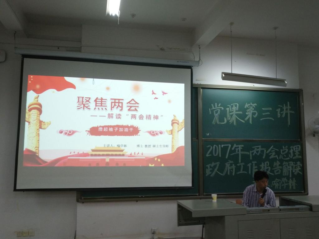 为深入学习贯彻全国两会精神,4月20日,威廉希尔williamhill官网于阳光校区08D-T201开展了第七十五期党课第三讲,由马克思主义学院副院长喻学林教授为威廉希尔williamhill官网近200名入党积极分子带来了题为《2017两会总理政府工作报告解读》的报告。