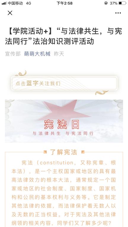 下一步,学院还将结合各年级、班级实际,通过新媒体等网络平台等渠道,组织开展主题海报比赛、知识竞赛、情景剧、演讲比赛等多种形式,深入开展“法律伴我行 宪法在我心”主题教育,让同学们进一步地学习宪法,了解宪法。