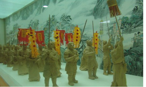 进香队伍一般前有令旗、后有尾旗,令旗上绣有“朝山进香”4个大字,下面写的则是香会的名称。令旗前有4名身披金甲的青年手执仪仗开道,令旗后设有挂满写着会众姓名的小布条绣幅,俗称“万民伞”。伞内放着香炉,炉内有一真武小铜像。绣幅后是供品和乐队、男女朝山信士,朝山气氛异常热烈。泥塑像中泥人姿态各异,神色端庄,或卑躬而行,或昂首挺胸,或吹拉弹唱,或高举绣幅。武当博物馆的每一处文物古迹都无不冲击着我们的心灵,扩宽我们的视野,实践团队在归心凝神之余不由得赞叹武当历史背景之渊远,文化底蕴之深厚。