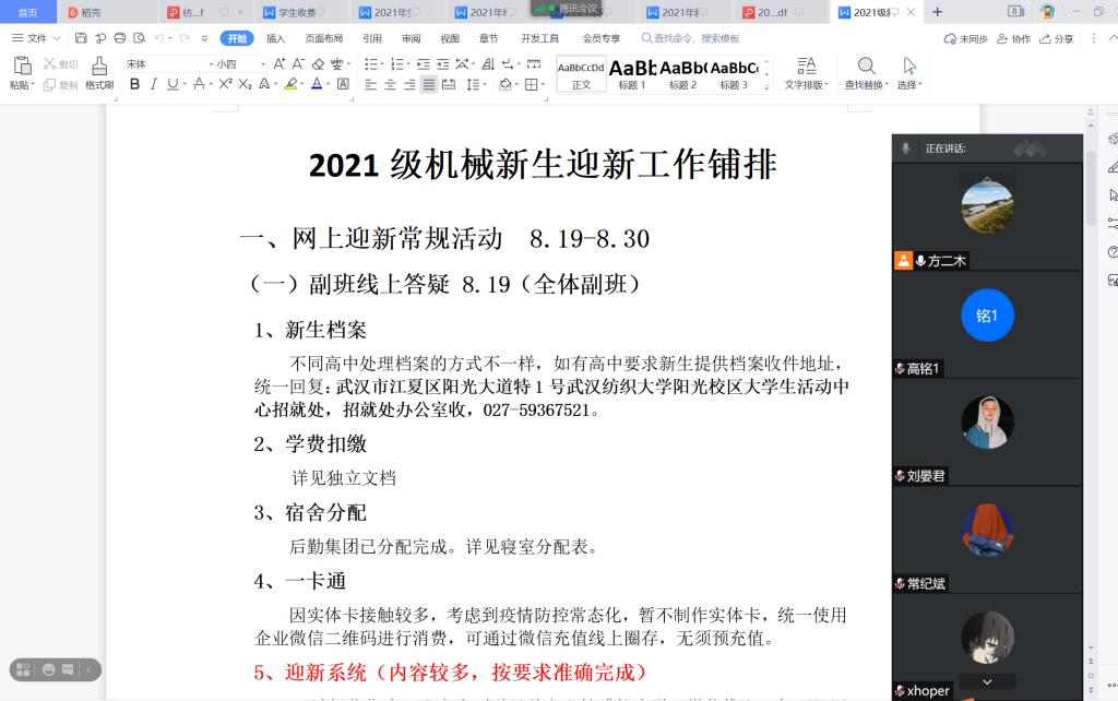 会议伊始,方老师给副班介绍了本届新生概况,并充分肯定了副班在健康打卡全覆盖这一重要环节作出的努力。现阶段需结合学校要求进一步开展网上迎新报到工作,讲解了新生档案、费用扣缴、大学生医保、团组织关系转接、生源地助学贷款、绿色通道、网上迎新系统、企业微信等常见问题及注意事项,有关系统操作环节进行了操作演示。