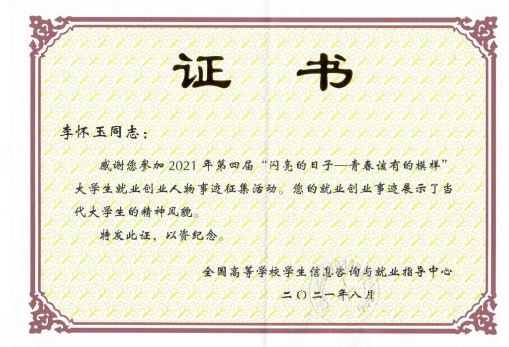 近日,教育部高等学校学生信息咨询与就业指导中心公布了2021年第四届“闪亮的日子——青春该有的模样”大学生就业创业人物事迹征集名单,我校推荐的威廉希尔williamhill官网2017届毕业生李怀玉创业事迹成功入选。