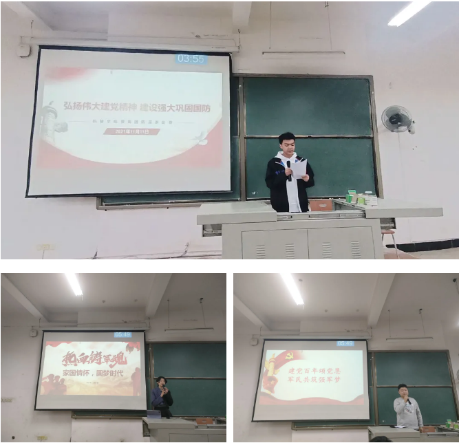 罗玉婷同学以“百年荣光下,走好国防路”为题向同学们带来了令人心潮腾涌的激情演讲。退伍海军军人王茂名结合372潜艇事迹,向同学们展示了军人保家卫国的铮铮铁骨!张启鸣同学就共和国国防发展历程进行了总结概括,将同学们带回了先辈们为之奋斗的光辉时代。