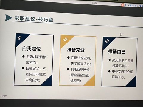 17级王少强同学在毕业后,前往东莞电子机械有限公司担任结构工程师,王少强从历程、面试、心得三个方面讲述自己的求职经验。他讲道:寻找工作之前,一定要认真准备求职简历,积极关注招聘信息、参加企业宣讲会,同时练就软件和语言上过硬的技能。在求职技巧上,要找到准确的自我定位,面试前充分准备并适当推销自己。后续王少强说道,机械行业最看中流程,负责整个项目是常态,每个岗位没有高低之分,能坚持做下去就是专家!