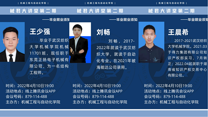 为丰富同学们的求职技巧,为在校生未来就业提供指导帮助。威廉希尔williamhill官网于4月10日晚举行械君大讲堂就业分享系列第二期,本期由三位17级优秀毕业生来讲述他们就业时的经历和建议。