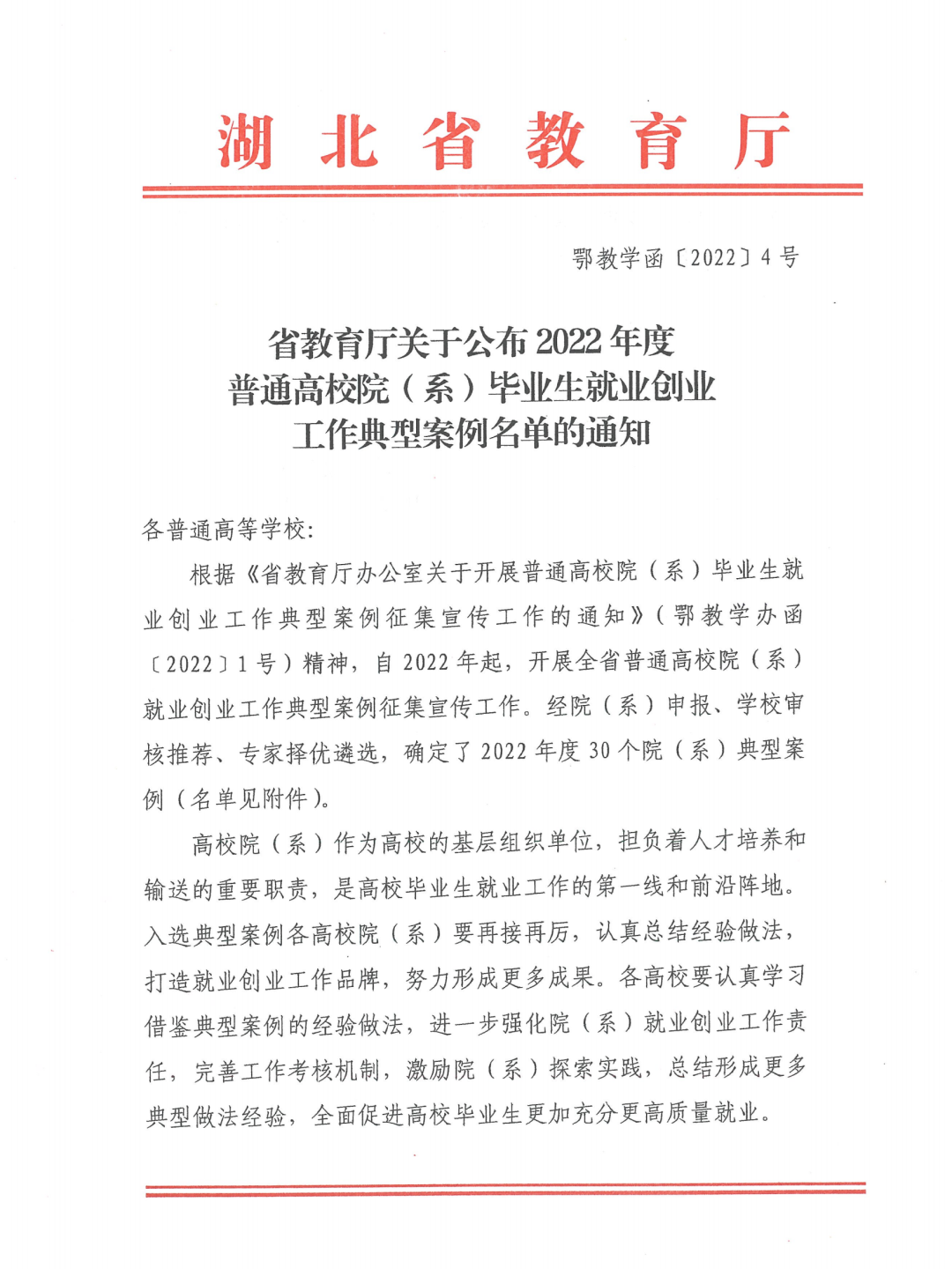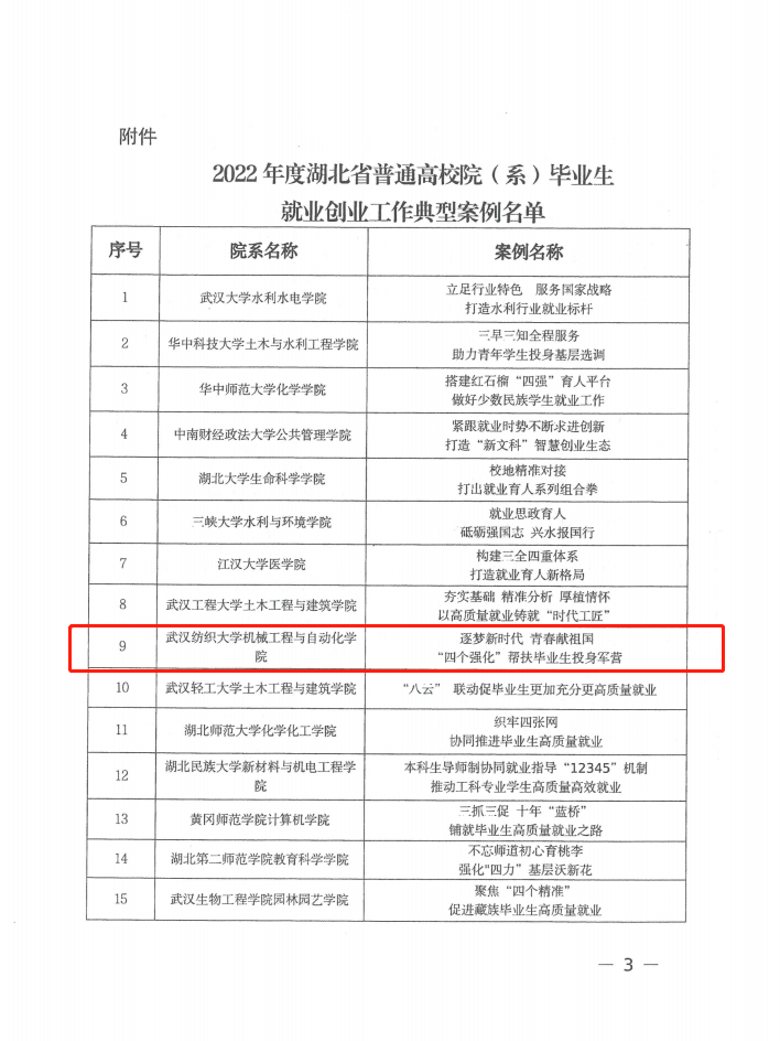 为总结推广工作中的典型经验做法,选树一批可学习、可借鉴、可推广的优秀案例和工作品牌,总结形成更多典型做法经验,促进全省高校毕业生更加充分更高质量就业,省教育厅启动了全省普通高校毕业生就业创业工作典型案例总结宣传工作,经各地各高校申报推荐,专家择优遴选,共确定30个典型案例。近日,湖北省教育厅公布了2022年度普通高校院(系)毕业生就业创业工作典型案例遴选结果,武汉纺织大学威廉希尔williamhill官网就业工作案例《逐梦新时代 青春献祖国——“四个强化”帮扶毕业生投身军营 》经过学校审核推荐、专家择优遴选,最终脱颖而出,成功获评湖北省普通高校院(系)毕业生就业创业工作首批典型案例。