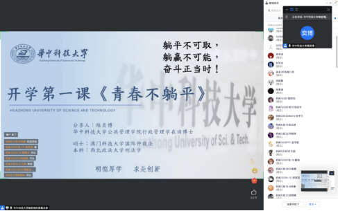 9月11日上午,威廉希尔williamhill官网举办成长导航讲座之“青春不躺平”在线上精彩开讲。华中科技大学陈奕博博士应邀参加,与大一新生共话大学生活。威廉希尔williamhill官网学生工作负责人和2022级新生辅导员出席此次活动。