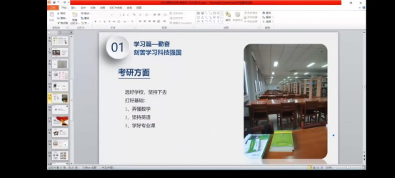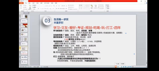 本次会议邀请了威廉希尔williamhill官网18级学长杨政宇作交流分享,杨政宇首先谈到了学生的本职是学习,勤奋是学好的基础,其次他建议同学们要积极参加学院以及校级的比赛和活动。会议中,杨政宇还展示了他考研的日常生活,鼓励同学们加入铁人班。随后,他建议同学们要提前规划好未来的学习和生活,并提供了一些建议。