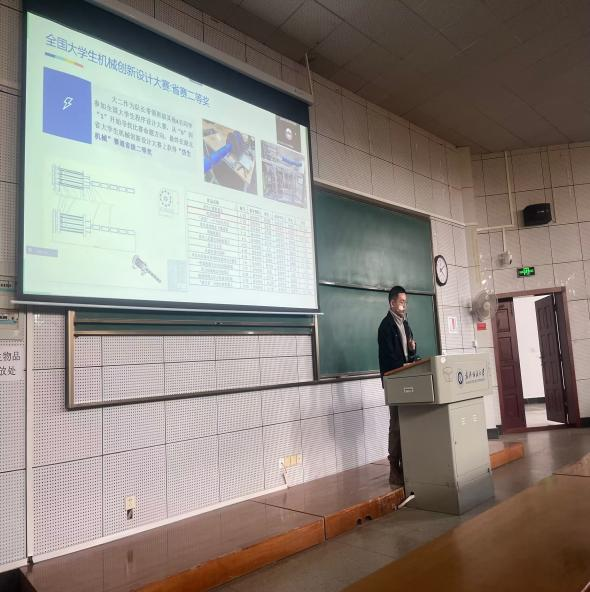 刘英琦以《一份不知道如何命名的PPT》风趣幽默的介绍前期学习生活的心得,介绍了参加机器人创意大赛所建模型在仿人格斗赛道获得了省赛一等奖和在全国大学生金相技能大赛获得个人二等奖的方法和经验。他提到要积极参加志愿服务活动,为社会出一份力,尽一份心。