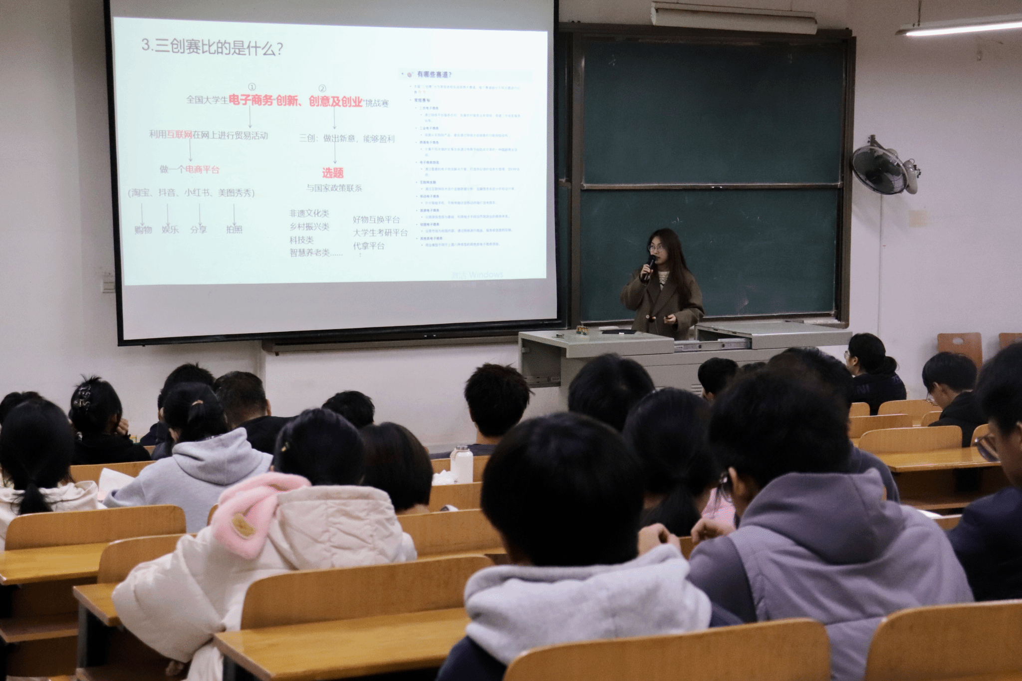 随后,刘晓宇同学结合自身大一时期参加“三创赛”的经历,从比赛意义、组建团队、题目遴选、策划案撰写等多个方面为同学们进行讲解与分享,现场分享省赛PPT让同学们更加深入地了解了此比赛。提问环节,刘晓宇学姐从组队条件、比赛周期、赛前准备等方面解答同学们疑问。