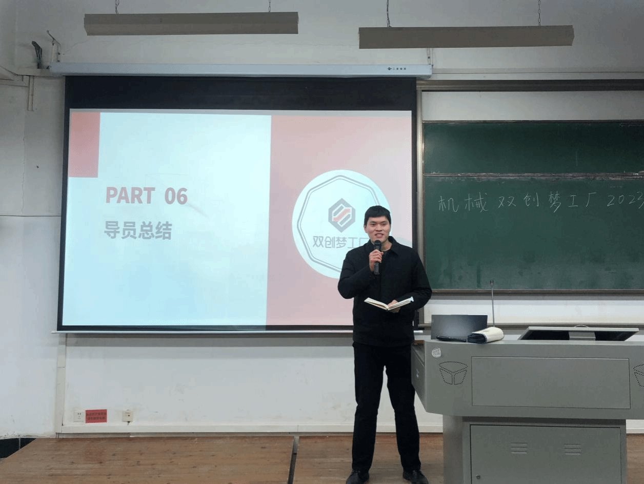 最后23级辅导员对大会进行总结。感慨机械双创梦工厂在短短一个月内就发展壮大并开展了六次竞赛沙龙分享并确信机械双创梦工厂在三个部门的开展下会越来越好!