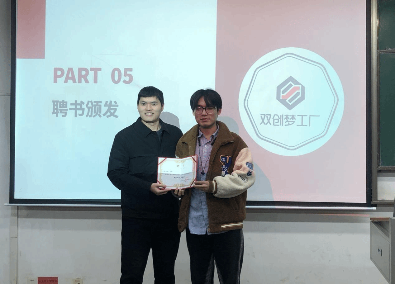 2024年威廉希尔williamhill官网双创梦工厂迎来第一位创新创业朋辈导师。大会第5项,辅导员徐智航为闫育杰学长颁发聘书。
