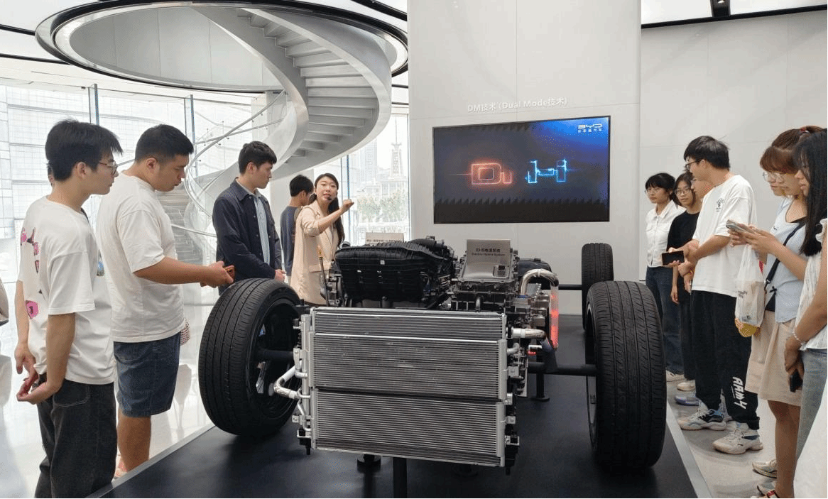 师生代表在比亚迪工作人员的带领下,参观了品牌中心的展厅。展厅内陈列着比亚迪最新的新能源汽车产品,从设计到工艺,每一处都体现出了比亚迪作为新能源汽车行业代表企业的先进创新科技。学生们纷纷驻足观看,交流心得,深刻感受到了比亚迪在科技创新方面的执着追求和坚定信念。在试驾区,学生们纷纷登上新能源汽车,感受其独特的驾驶体验和智能化功能。他们纷纷表示,这次亲身体验让他们更加深入地了解了新能源汽车的优势和未来发展潜力。