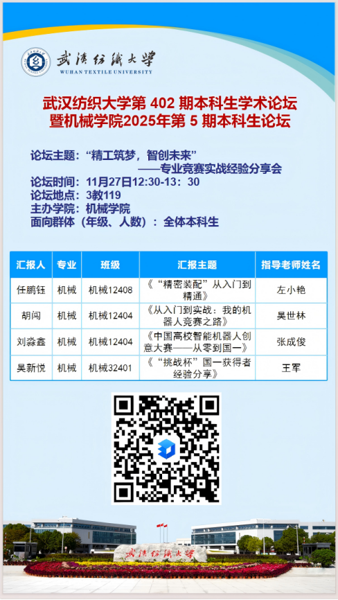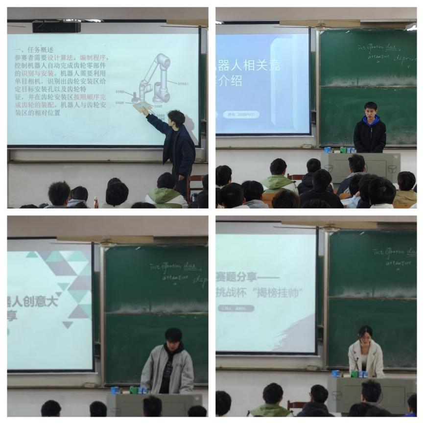 本次论坛以“精工筑梦,智创未来”为主题,特邀任鹏钰、胡闯、刘淼鑫、吴新悦四位在国家级顶尖赛事中斩获佳绩的杰出学子进行专业竞赛实战经验分享,为在场同学呈现了一场精彩纷呈的经验盛宴。在分享环节中,任鹏钰同学以《“精密装配”从入门到精通》为题,系统介绍了“智能精密装配赛”的赛事体系与技术要求。胡闯同学在《从入门到实战:我的机器人竞赛之路》中,分享了他从基础学习到独立设计机器人系统的完整历程。刘淼鑫同学则通过《中国高校智能机器人创意大赛——从零到国一》,系统复盘了从零起步到问鼎全国一等奖的完整路径;吴新悦同学作为《“挑战杯”国一获得者经验分享》的主讲人,则从团队、项目、答辩等多维度揭秘了高水平竞赛的取胜之钥。在提问环节中,同学们围绕备赛时间安排、团队协作技巧等问题与四位分享人展开深入交流,现场气氛热烈。