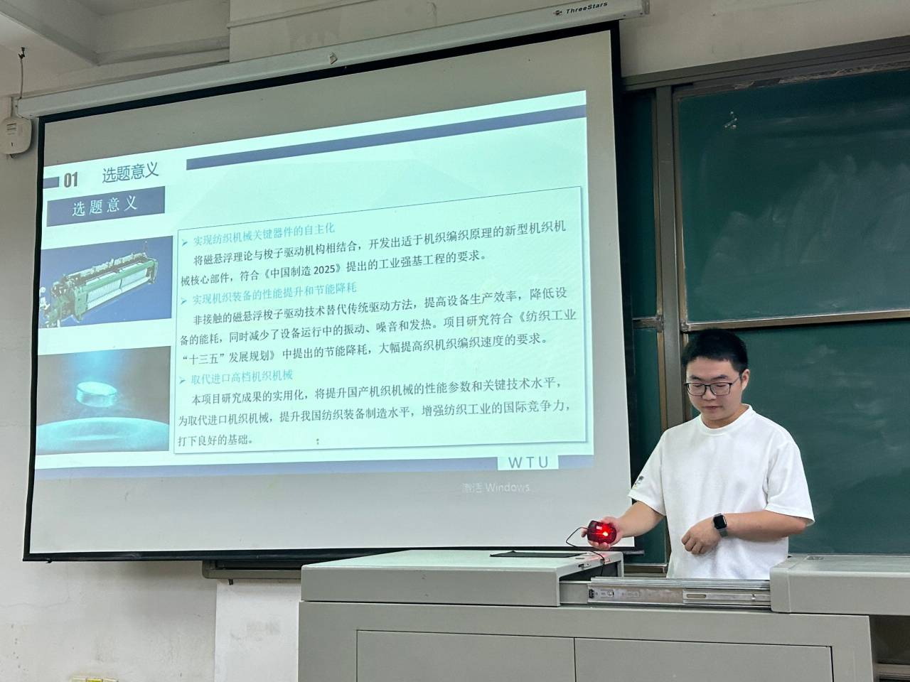 万济滔同学介绍了他的研究课题“基于离心纺的纤维基导电薄膜的制备方法与性能研究”。万济滔同学的研究关注了导电材料的制备方法,具有广泛的电子和材料科学应用。高老师提出“研究中使用的导电薄膜在哪些应用中具有潜在的优势?是否考虑了不同离心纺条件下的材料性能?”鼓励万同学继续优化制备方法,以实现更好的性能,并探索更多的应用领域。