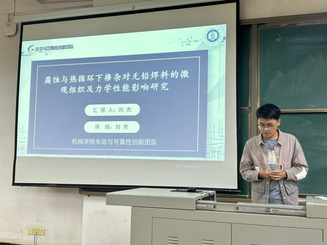 刘杰同学分享了他的研究课题“腐蚀与热循环条件下掺杂对无铅焊料的微观组织与力学性能影响研究”。刘杰同学的研究聚焦在无铅焊料的性能和稳定性研究,具有电子制造领域的重要性。高老师提出“研究已经取得了哪些对电子制造业有实际价值的发现?是否考虑了不同腐蚀和热循环条件下的变化?”建议刘同学在未来研究中进一步深入探讨无铅焊料的微观组织与力学性能之间的关系,并实验更多的应用场景。。