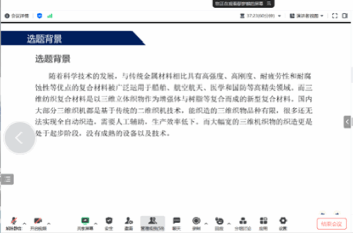 石玉文同学分享了他的研究课题“基于机器视觉的碳纤维织物质量检测”。石玉文同学的研究聚焦于机器视觉在碳纤维织物质量检测中的应用,体现了先进技术在纺织行业的创新。宋教授鼓励他深入研究机器视觉技术的优化和适用性,考虑将该方法应用于不同纤维材料的质量检测,并关注实时性和准确性的平衡。