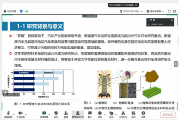 最后,汪子升同学介绍了他的研究课题“碳纤维织物增强复合材料螺旋铺层设计方法与力学性能研究”。汪子升同学的研究关注碳纤维织物在复合材料中的应用,是先进材料领域的重要研究方向。宋教授鼓励汪同学深入研究螺旋铺层设计的原理和优化方法,考虑将其应用于不同类型的碳纤维复合材料,关注性能和轻量化的平衡。