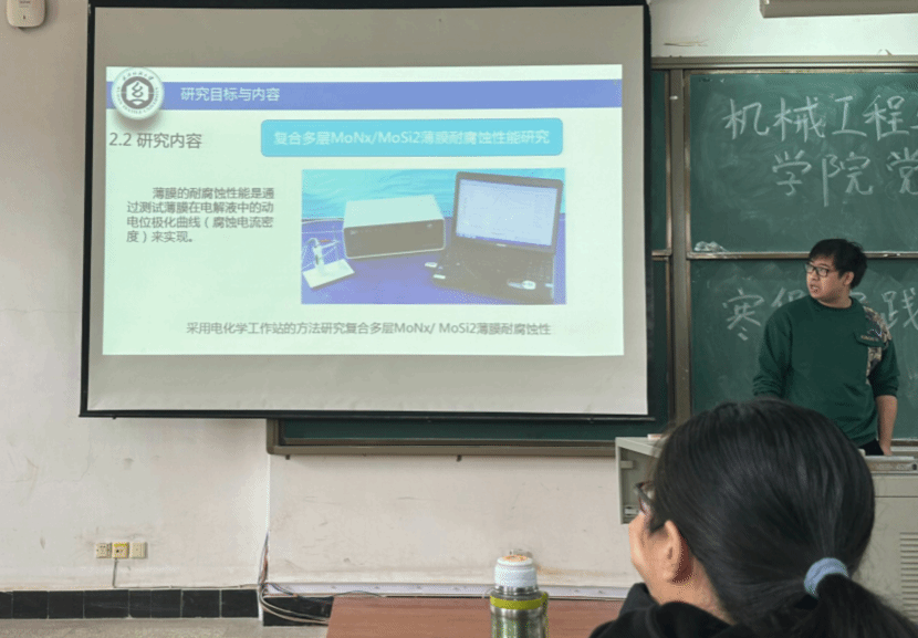 第四位是闫冠宇同学分享了他的研究课题“MoNx/MoSi2复合多层薄膜的磁控溅射法制备及性能研究”,要丰富该领域的知识为将来应用到其他方向打下基础。孙教授与其进行了专业性的讨论,为后面的工作开展提供了思路和帮助。