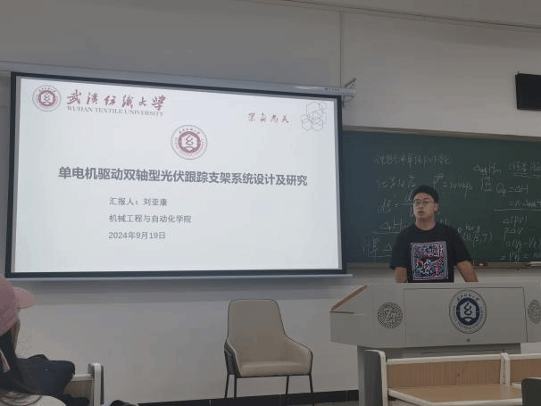 刘亚康同学分享了他的研究课题“单点机驱动双轴型光伏跟踪支架系统设计及研究”,其研究的内容主要是设计一种机械传动装置取代双轴跟踪支架系统中驱动光伏组件仰俯轴转动的电机,以最小化的电机数量实现了光伏组件的双轴跟踪。