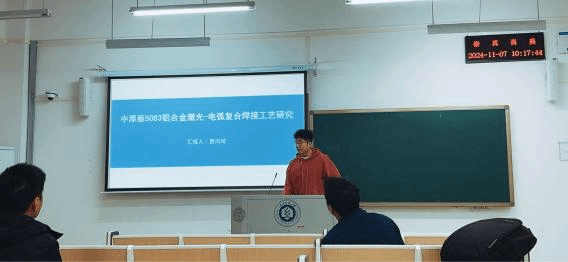 曹向琦同学分享了他的研究课题“GIL管道外壳激光-电弧复合焊接技术研究”,其研究的内容为分析GIL(Gas-Insulated Line气体绝缘输电线路)管道外壳常用材料如铝合金、铜合金等的物理和化学特性,研究不同材料在激光-电弧复合焊接条件下的相容性和焊接性能,研究激光功率、波长、脉冲宽度等参数对焊接质量的影响。曹龙超老师指出GIL管道外壳激光-电弧复合焊接技术研究是一个涉及材料科学、焊接工艺和工程应用的综合性课题,探讨未来可能的技术改进方向,如新型激光器、智能控制系统,研究该技术在其他领域的潜在应用,如航空航天、汽车制造等。