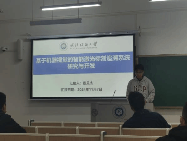 殷艾杰同学分享了他的研究课题“基于机器视觉的智能激光标刻追溯系统的研究与开发”,研究内容为研究高分辨率相机、镜头、光源等硬件的选择与配置,确保图像采集的清晰度和稳定性,应用图像处理算法(如边缘检测、形态学操作、图像分割等)对采集到的图像进行预处理,提高图像质量,研究特征提取算法(如SIFT、ORB、深度学习等),从图像中提取出关键特征,用于后续的识别和定位。曹龙超老师指出基于机器视觉的智能激光标刻追溯系统的研究与开发是一个涉及多学科交叉的综合性课题,主要包括机器视觉、激光标刻技术、追溯系统设计与开发等多个方面,要全面了解基于机器视觉的智能激光标刻追溯系统,为实际应用提供科学依据和技术支持。
