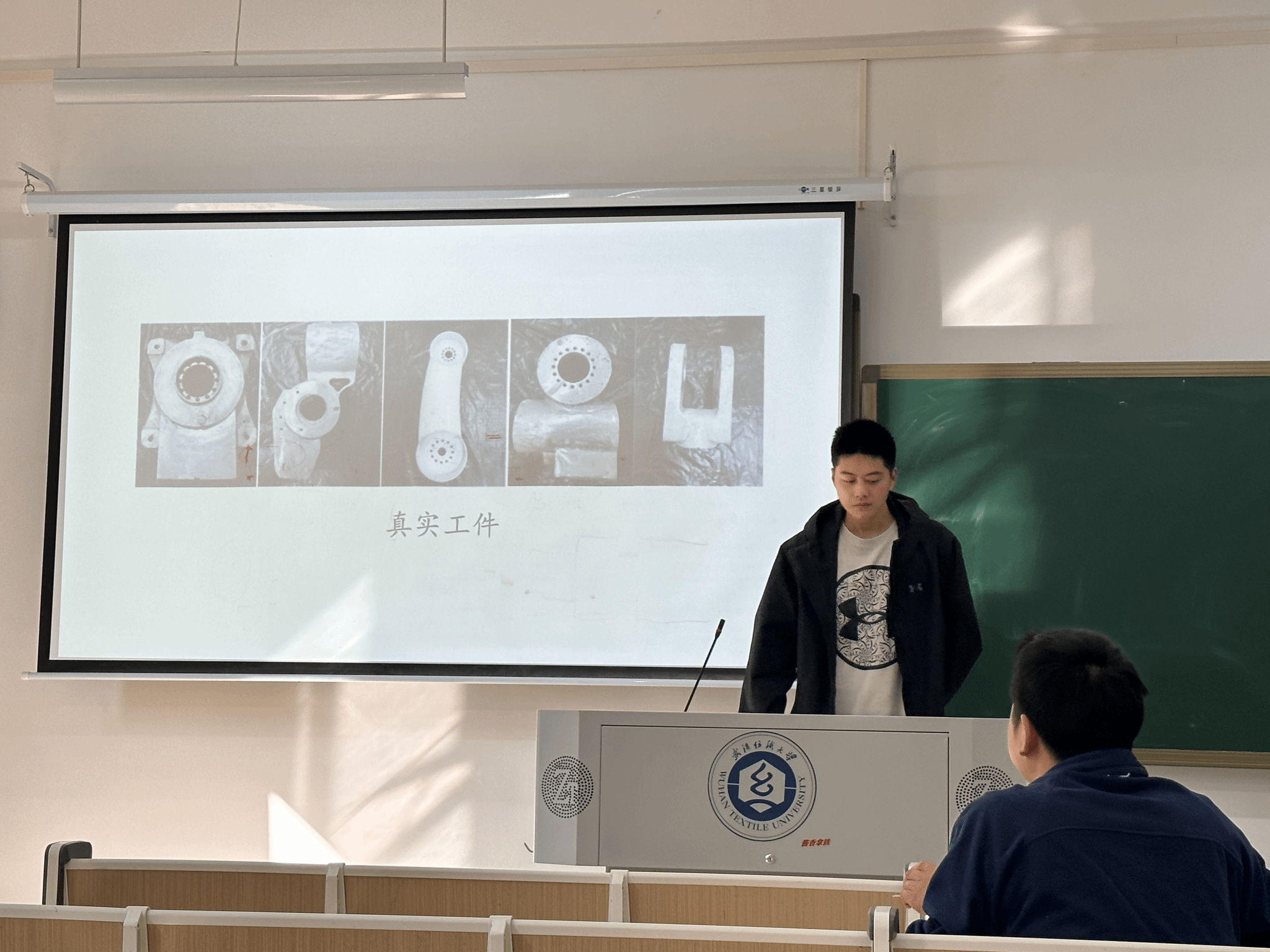 曾文豪同学分享了他的课题“面向复杂工件结构光点云生成及重建”,其研究内容为研究结构光扫描的基本原理,包括相移法、傅里叶变换法等,确保扫描精度和速度,设计高效的投影模式(如编码结构光、条纹结构光等),提高扫描效率和精度,研究相机和投影仪的标定方法,确保扫描准确性和稳定性。曹龙超老师指出研究该系统在其他领域的潜在应用,如文物保护、医学成像等,探讨未来可能的技术改进方向,如新型结构光技术、多模态数据融合等,要全面了解面向复杂工件的结构光点云生成及重建,为实际应用提供科学依据和技术支持。