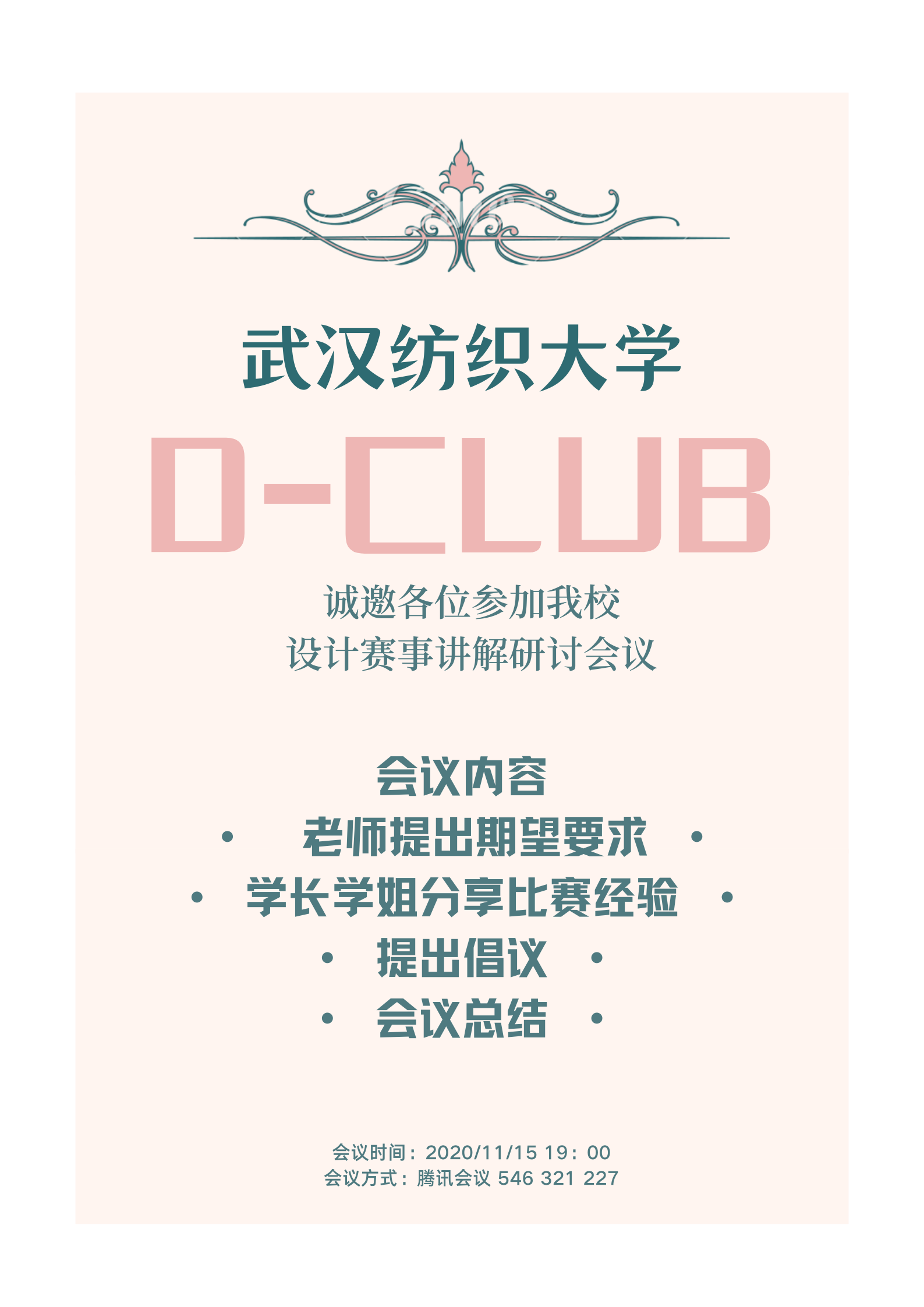 11月15日晚,威廉希尔williamhill官网D-Club俱乐部开展第一次设计赛事研讨活动,会议在腾讯会议APP举行。院党委副书记刘韦、工业设计系庞爱民副教授和辅导员肖锦老师参加会议,会议由朱李丽老师主持。工业设计专业四个年级的学生汇聚一堂,共同分析探讨了从设计赛事到专业学习的心路过程及经验分享。