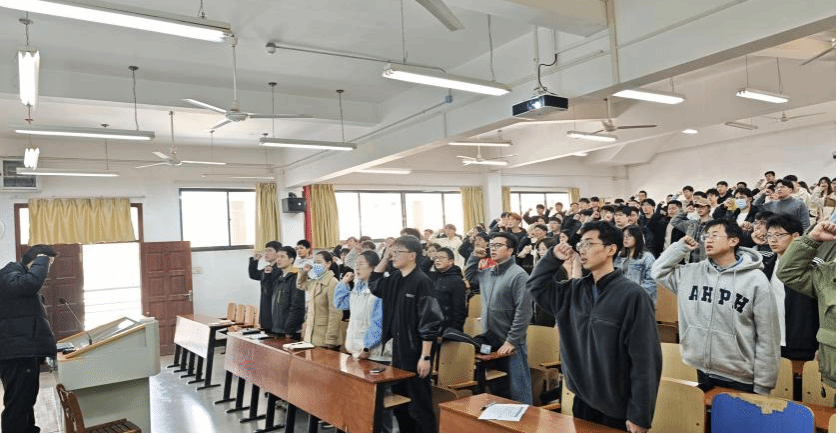 首先,全体党员起立奏唱国歌,杜焱铭同学的带领全体党员重温入党誓词,领学十四届全国人大三次会议精神,会议以习近平新时代中国特色社会主义思想为指导,全面贯彻落实党的二十大和二十届二中、三中全会精神,深刻领悟“两个确立”决定性意义,增强“四个意识”、坚定“四个自信”、做到“两个维护”。随后,马作浩同学给大家带来了《从全国两会看科技创新》主题党课。他以科技创新为核心,从全国两会精神出发,系统阐述了我国科技战略部署与实践路径。通过解读两会政策,明确了“人工智能+”与新质生产力发展任务。他还结合我校最新科研成果和办学特色进行讲解,激发了全体学生党员建设智造中国的信心和决心。通过“揭榜挂帅”激励和项目年轻化,呼吁我们广大青年勇担创新使命,响应习近平总书记“让青春在创新中闪光”的号召。