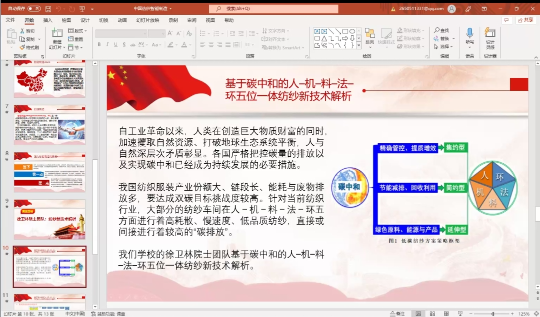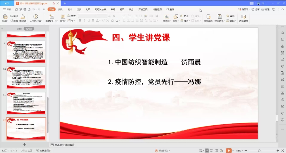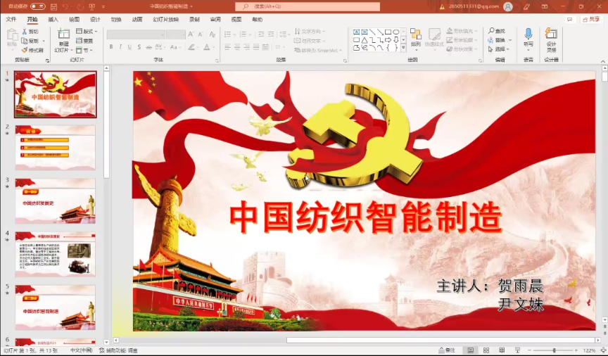 随后由贺雨晨同学和冯娜同学主讲了本次主题党课。贺雨晨同学从纺织发展史、中国纺织智能智造和徐卫林院士团队纺纱新技术解析等三个方面解读了纺织智能制造,冯娜同学结合自身在家乡抗疫事迹等号召全体党员在学校疫情防控中切实发挥党员先行的表率作用。