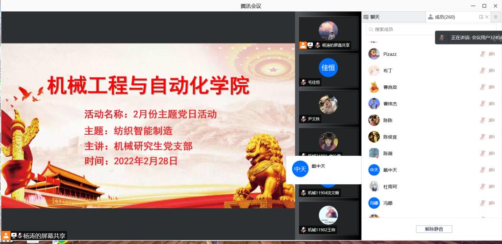 春暖花开,同心抗疫。2月28日中午12:30,威廉希尔williamhill官网在腾讯会议上围绕“纺织智能制造”和“疫情防控”召开支部主题党日活动。本次活动由威廉希尔williamhill官网研究生党支部主讲,威廉希尔williamhill官网党委副书记刘韦、全体辅导员老师和学生党员参加活动,活动由研究生党支部支委杨涛同学主持。