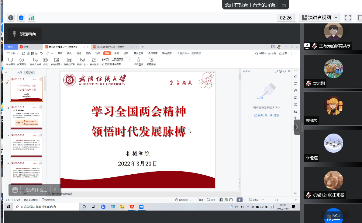 此前一周,各年级学生已按照学院要求,结合各自实际,多渠道、多途径收听收看了2022年全国“两会”有关报道并开展了自学。威廉希尔williamhill官网下一步还将发挥学院专业特色优势,开展主题党团日活动、专题讲座、朋辈领航、学习研讨会,深入进行“两会”精神交流互学,以期达到更好效果。