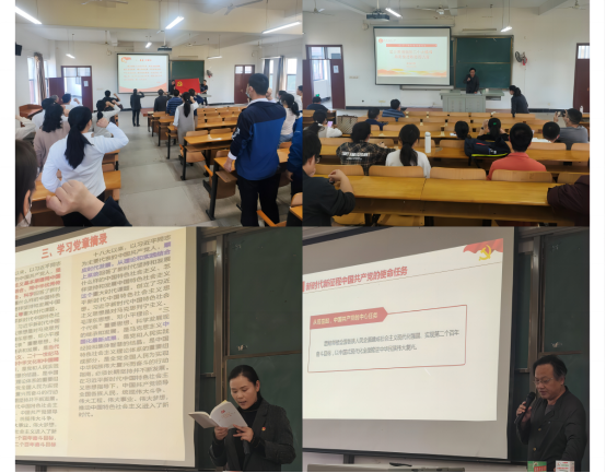 首先,周玉艳带领教工支部全体党员重温了入党誓词,导读《中国共产党章程》的新观点、新论断并研习党章修改之处。随后,学院党委书记干文勋做了“学习贯彻党的二十大精神,凝聚奋进新征程力量”的辅导报告。干书记从党的二十大报告总体框架角度进行分析,带领大家重点深刻领会党的二十大的主题,过去5年的工作和新时代10年的伟大变革,开辟马克思主义中国化时代化新境界以及新时代新征程中国共产党的使命任务等重要内容。他强调,教师党员要深入带头学习宣传党的二十大精神,以更加饱满的工作热情、严谨的工作态度和扎实的工作作风,全力投入到教育教学工作中去,为学校高质量发展做出自己的贡献。