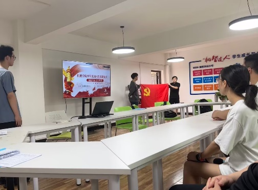活动开始,全体党员起立奏唱国歌,在党旗下重温入党誓词。为了强化《中国共产党章程》意识,增强党员责任感,由吴晨曦同学带领大家学习了《中国共产党章程》第三章第二十二条与二十三条中党的中央委员会的召开以及党委选举的要求等一系列事项,让同志们牢记党组织的纪律。