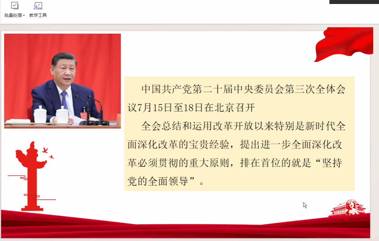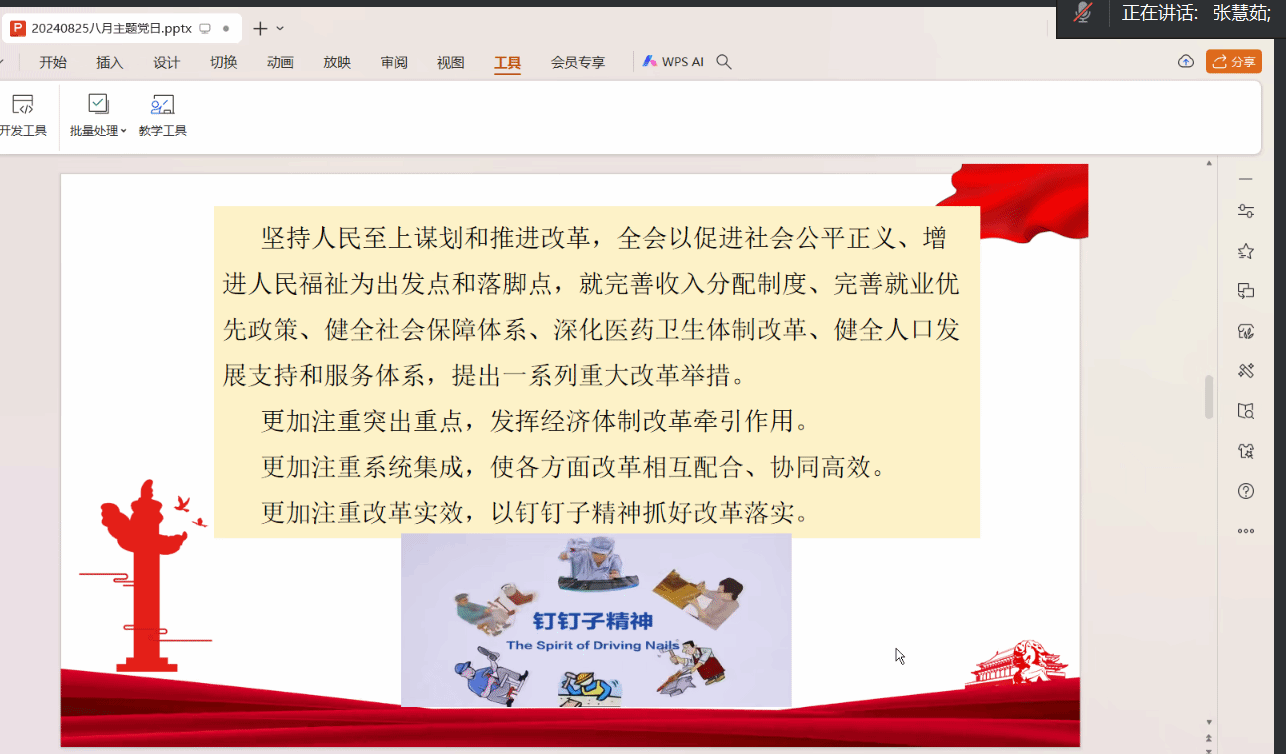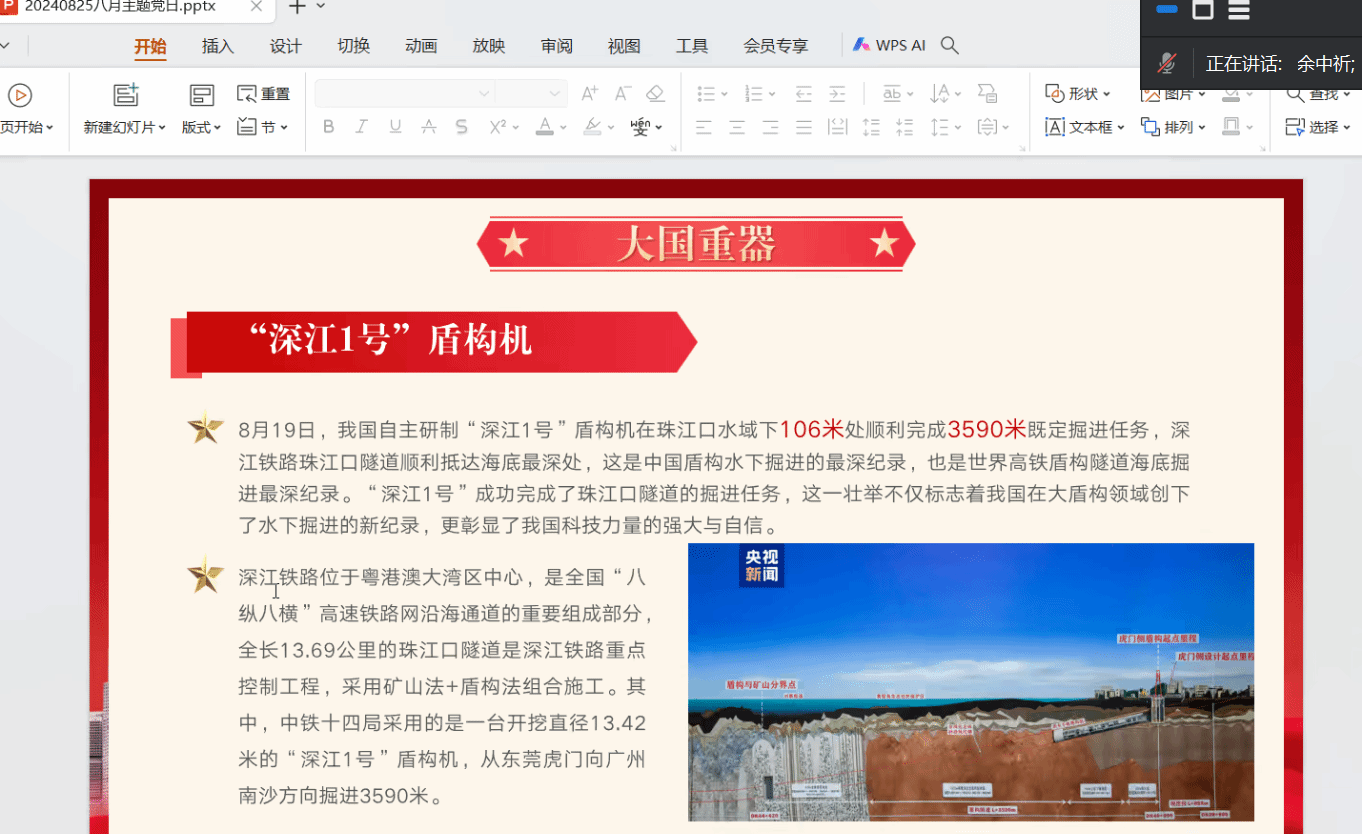 会上,大家奏唱了国歌,诵读了党章。随后,张慧茹同志领学了习近平新时代中国特色社会主义思想专题摘编和党的二十届三中全会精神。接着,余中祈同志结合大国重器“深江1号”、无人机、新能源汽车等中国智造典型代表进行“智造中国”党课主题分享,坚定信念,必须进一步加强科技创新与产业创新融合发展,促进科技、产业、金融良性循环,构建与新质生产力相适应的新型生产关系,让各类先进优质创新要素向发展新质生产力集聚,不断催生新产业、新模式、新动能。