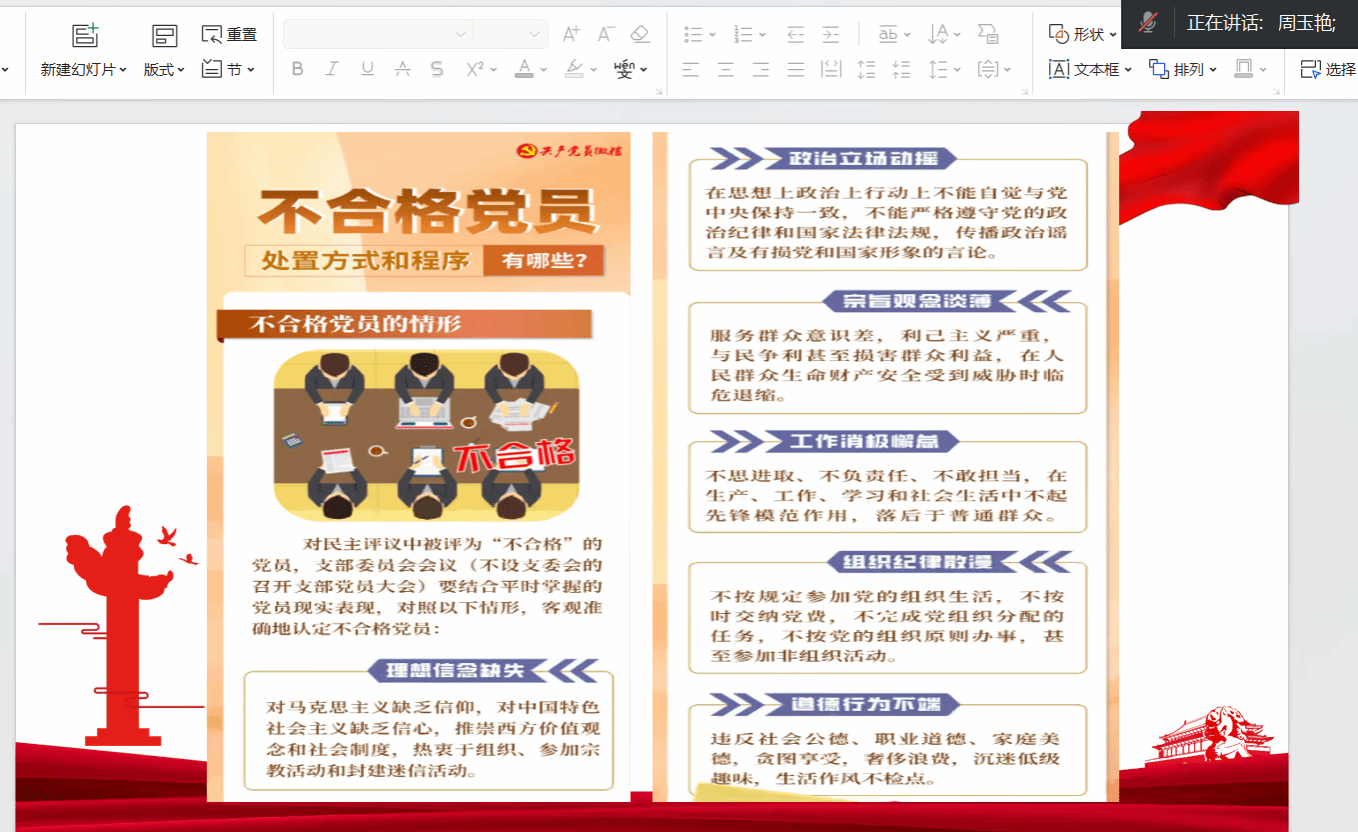 最后,周书记开展了《中国共产党不合格党员组织处置办法》专题学习,结合示例讲解了不合格党员具体表现、处置方式和相关程序等,强调要不断深化党纪学习教育,时刻牢记党员身份,增强党员意识,发挥先锋模范带头作用。
